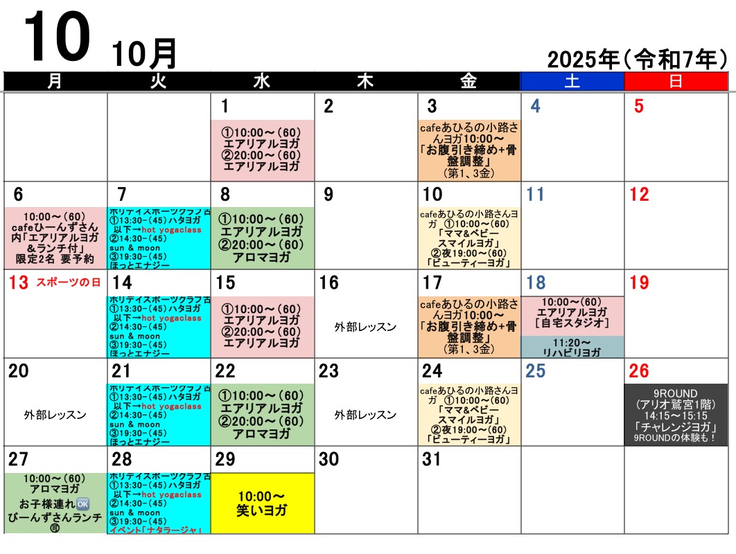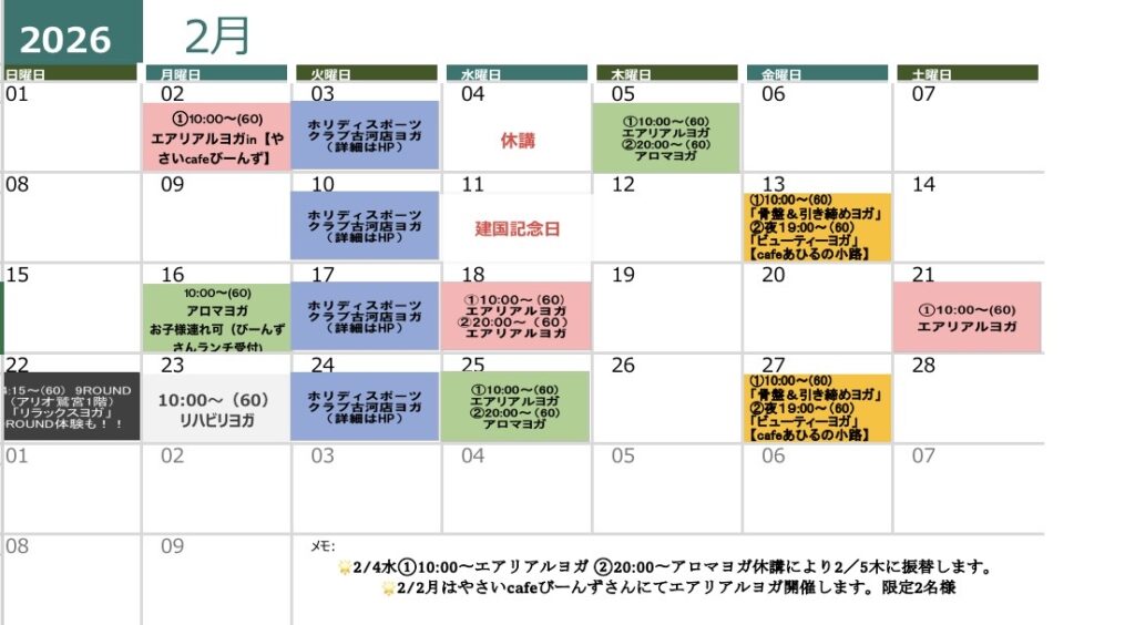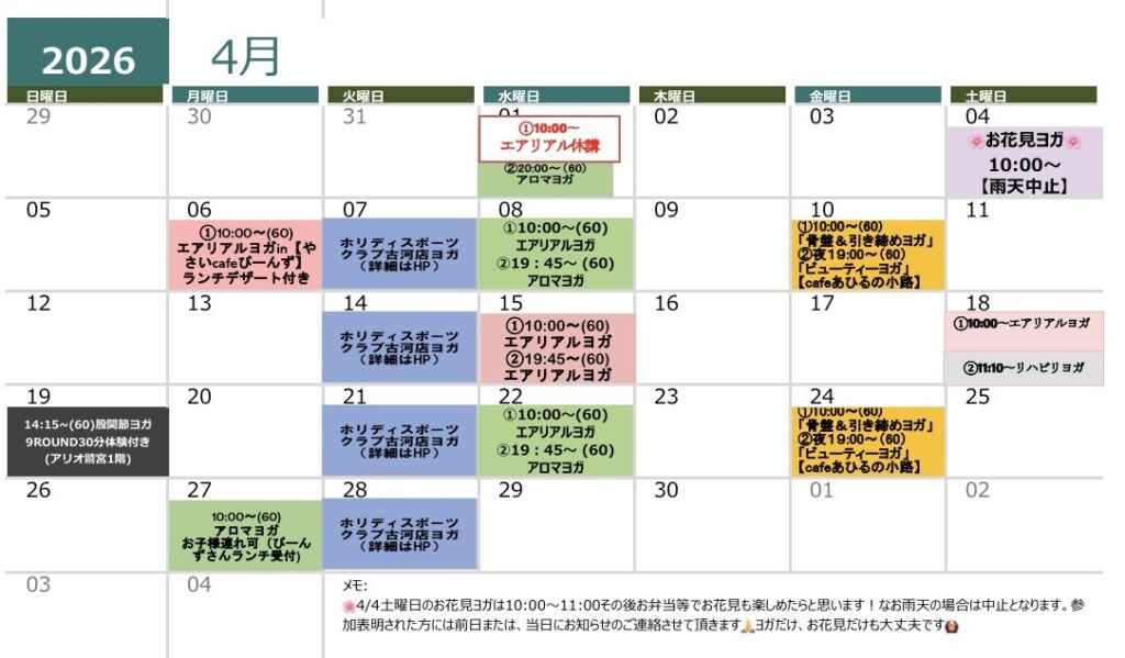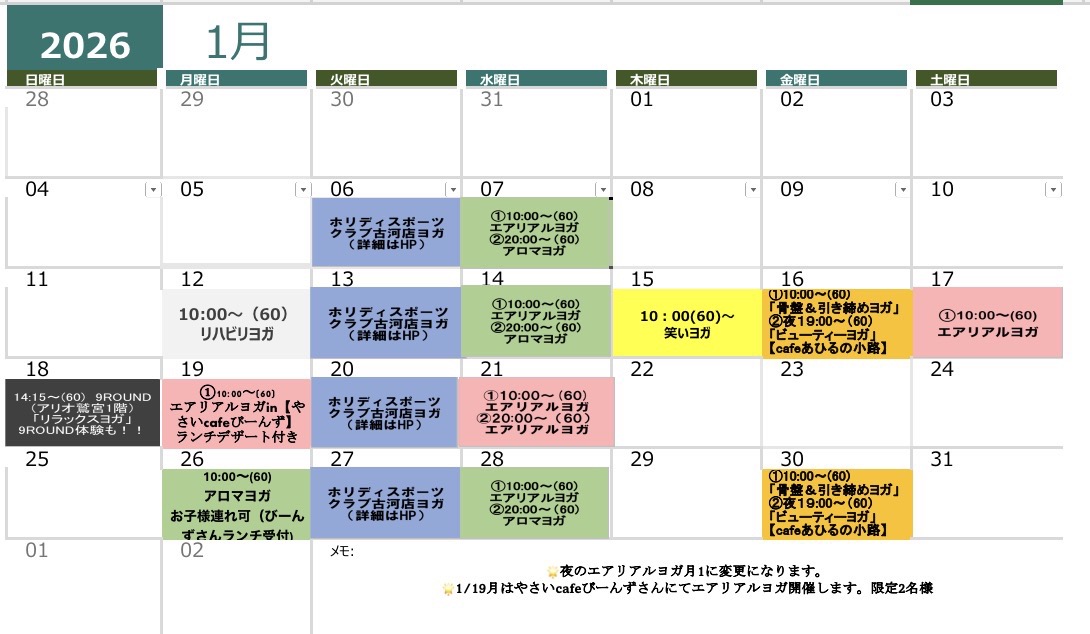 ※自宅スタジオ以外のレッスンは現地払いとなります。*9ROUNND→¥2000 *cafeびーんずさんランチデザート付きエアリアルヨガ→¥5000 ※笑いヨガはワンコインです。